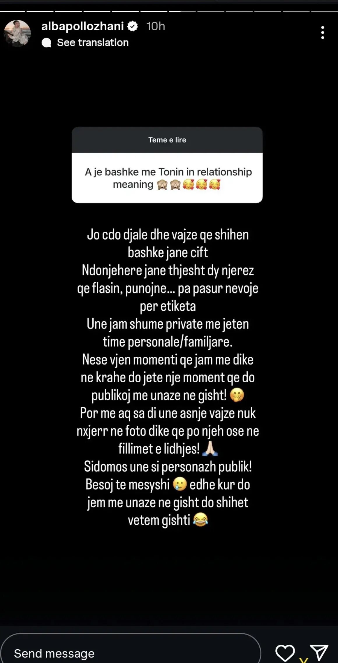 Përmes një bashkëbisedimi me ndjekësit në Instagram, Alba është pyetur drejtpërdrejt nëse mes saj dhe Toneyt ka diçka më shumë sesa shoqëri.