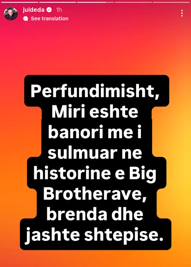 “Përfundimisht, Miri është banori më i sulmuar në historinë e Big Brother-ave, brenda dhe jashtë shtëpisë“, tha aktori në InstaStory.