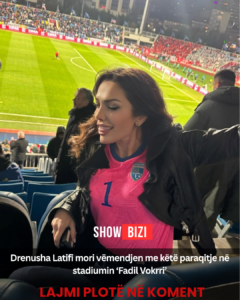 Këngëtarja dhe ish-missi shqiptar, Drenusha Latifi, është një tjetër figurë publike që po e ndjek nga afër ndeshjen historike në stadiumin Fadil Vokrri, ku po përballen Kosova dhe Turqia.