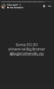 Përmes një postimi në Instagram, gazetarja konfirmoi se sonte në orën 20:30 do të jetë sërish pjesë e shtëpisë më të famshme, por këtë herë si mysafire speciale në edicionin e pestë.