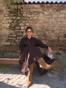 E ulur mbi një stol druri, ajo ka zgjedhur një veshje klasike, me një pallto të gjatë dhe çizme të gjata që kombinohen në mënyrë perfekte me shallin që i mbron flokët nga era.