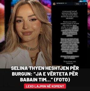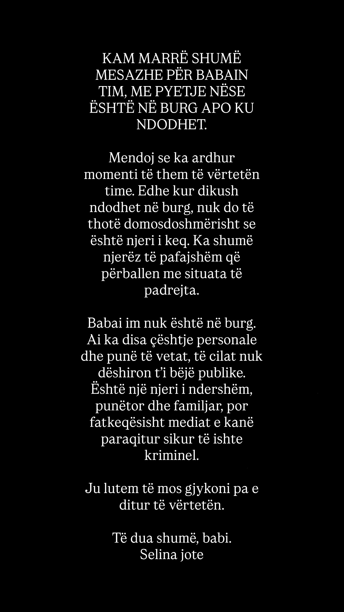 Në një reagim emocional, ajo ka sqaruar se është pyetur vazhdimisht nga ndjekësit nëse babai i saj ndodhet në burg apo ku është aktualisht. Përballë këtyre komenteve dhe spekulimeve, Selina ka zgjedhur të flasë vetë, duke thënë se ka ardhur koha që publiku të dëgjojë versionin e saj.