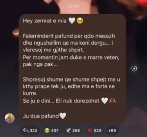 “Hey zemrat e mia,” ka thënë ajo, duke iu drejtuar ndjekësve të saj. Kjo mënyrë e komunikimit tregon se ajo është e lidhur ngushtë me ata dhe dëshiron të ndajë ndjenjat e saj në këtë moment delikat.